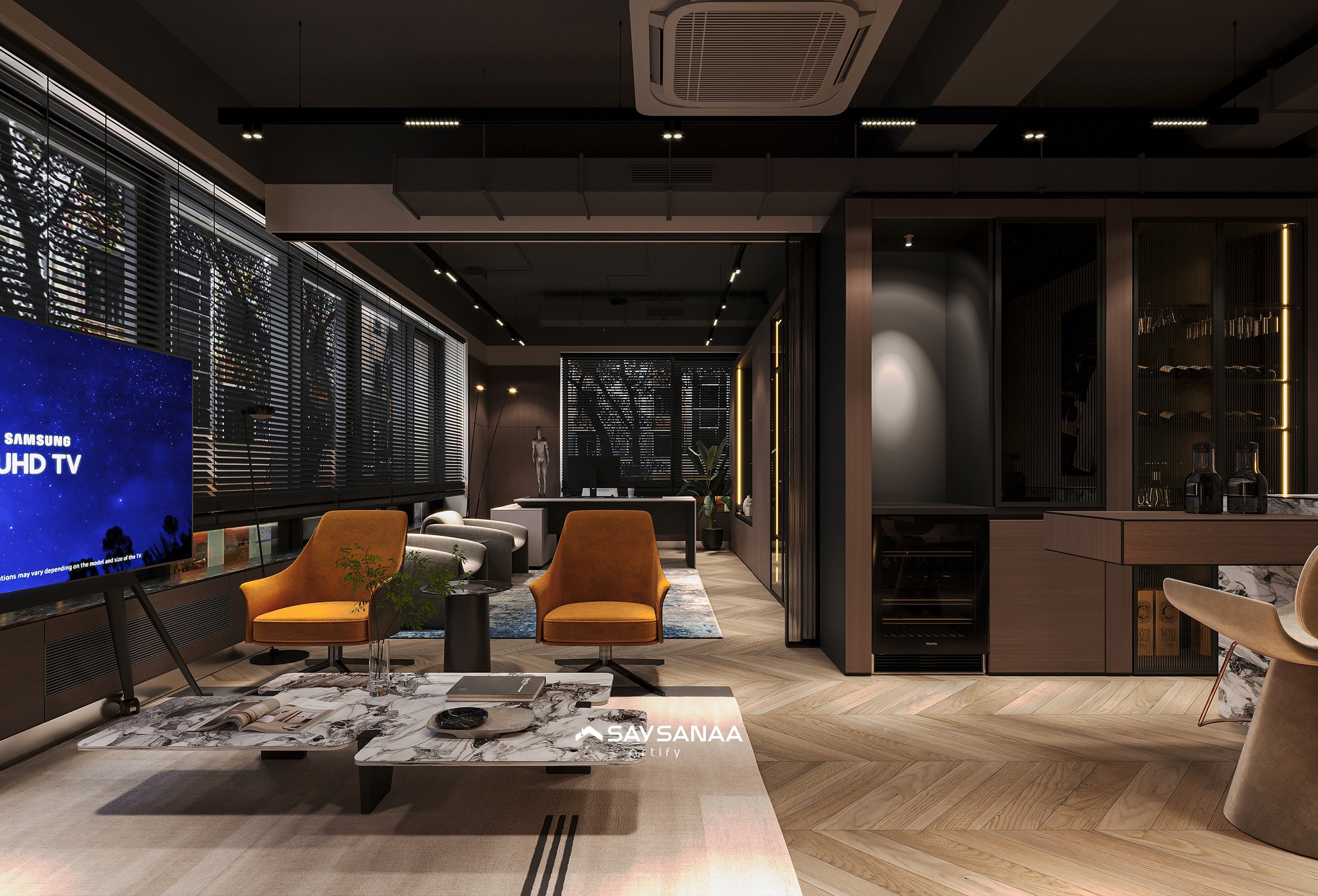 Энэхүү төслийн зорилго нь удирдлагын өрөөг уламжлалт “CEO кабинет” гэх ойлголтоос ангид авч үзэж, ажлын төвлөрөл · стратегийн уулзалт · executive-level hospitality гэсэн гурван үндсэн функцийг нэгэн цул, логик орон зайн систем болгон нэгтгэхэд чиглэв. Орон зайн зохион байгуулалт нь гурван давхар бүтэцтэй. Зөөлөн органик хэлбэртэй уулзалтын лаунж бүс нь харилцааг тайван, уян болгож, hospitality zone нь marble counter, coffee & wine setup-ээр executive-level зочлох соёлыг илэрхийлж байна. Эдгээр бүсүүд нь удирдагчийн өдөр тутмын ажлын хэмнэл, уулзалтын динамикт нийцсэн урсгалаар уялдан төлөвлөгдсөн. Rippled glass partition нь орон зайг бүрэн тусгаарлахгүйгээр ялгаж, ажлын болон уулзалтын бүсүүдийн хооронд жигд, тасралтгүй шилжилт хийх боломжийг бүрдүүлнэ. Ингэснээр орчны нэгдмэл байдал алдагдахгүй, баланс хадгалагдана. Энэхүү интерьер нь удирдагчийн бодол боловсрох, яриа гүнзгийрэх, шийдвэр төрөх процессыг дэмжих хүчтэй supporting environment болж төлөвлөгдсөн юм.